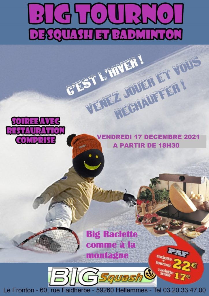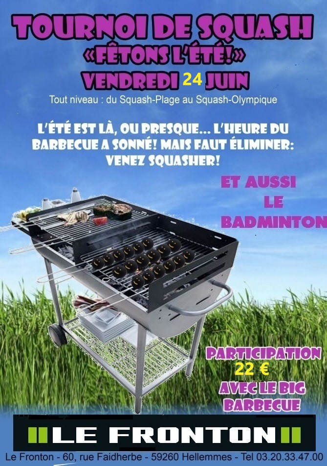 Squash : Tableau de 32 maxi et Plateau de 16 —- Badminton en double : 8 équipes maxi ….. PAF : 8€ le tournoi seul et 17€ avec le Buffet . Départ des premiers matches : Vous présentez entre 18h00 et 19h30 –Premiers arrivés Premiers servis — Plus d’infos à l’accueil du Fronton : tel 0320334700