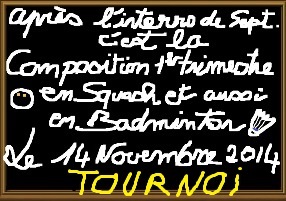 Le Vendredi 14 Novembre 2014 De 18h00 à 24h00 — Squash . Paf : 14 € avec le Big buffet repas préparé par nos cantiniers du Fronton.