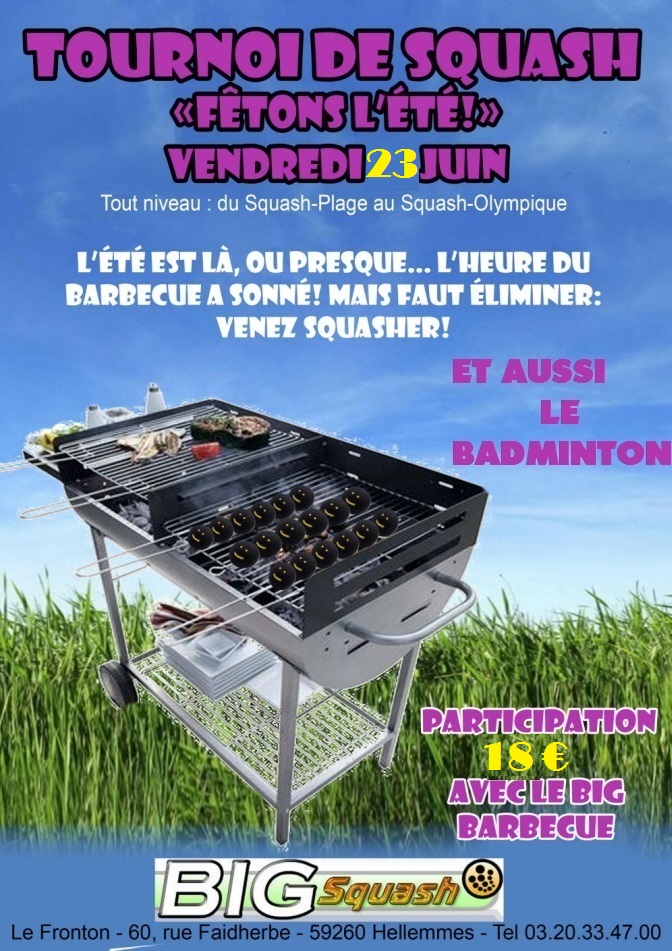 Squash : En individuel . Démarrage des matches de 18h30 à 19h30. Premiers arrivées Premiers servies . Jusque 24h00 avec Break Barbecue . Paf 18€